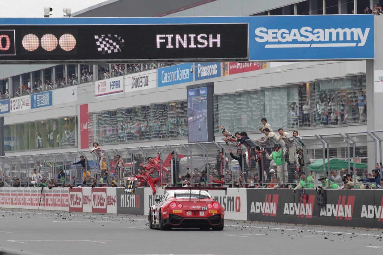レースも残り5時間となった11時ごろ、トップ争いをしていた#300 GT-Rがピットイン。そして駆動系のトラブルのためにピットガレージに入れられた。これで楽になった#1 GT-Rだったが、ペースを緩めることなく決められたラップタイムで周回を重ねた。レースも残り1時間を切った14時18分、藤波がピットインして浜野へ交代。浜野は最後までミスなく周回を重ね、801周、3,654.963kmを走り切って歓喜のチェッカー。ウィニングラップを終えて星野、藤波、平峰を乗せてピットロードを凱旋走行で表彰台下に戻ってきた。富士24時間を連覇して、シリーズ戦も連勝。これで79点を追加して、一気にポイントリーダーに駆け上った。